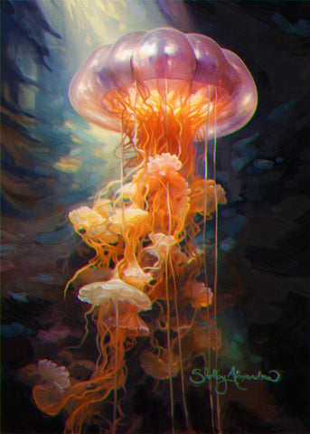 A peachy jelly floats serenely in the ocean’s depths, beckoning you to immerse yourself in the ethereal beauty of the sea. Bring the tranquility of this squishy marine creature into your home with this timeless print.