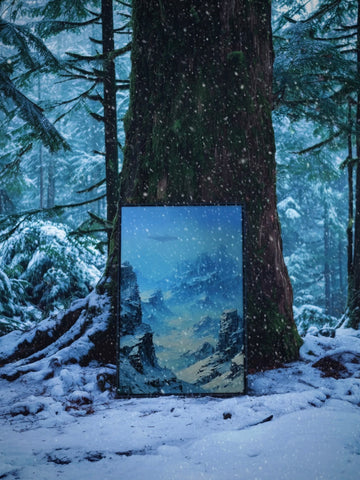 This piece captures a quiet, icy landscape of sheer blue mountain cliffs under a cold, open sky. At first glance, it feels calm and expansive. Then you notice it. A barely there UFO, hovering just long enough to make you question what you’re seeing.