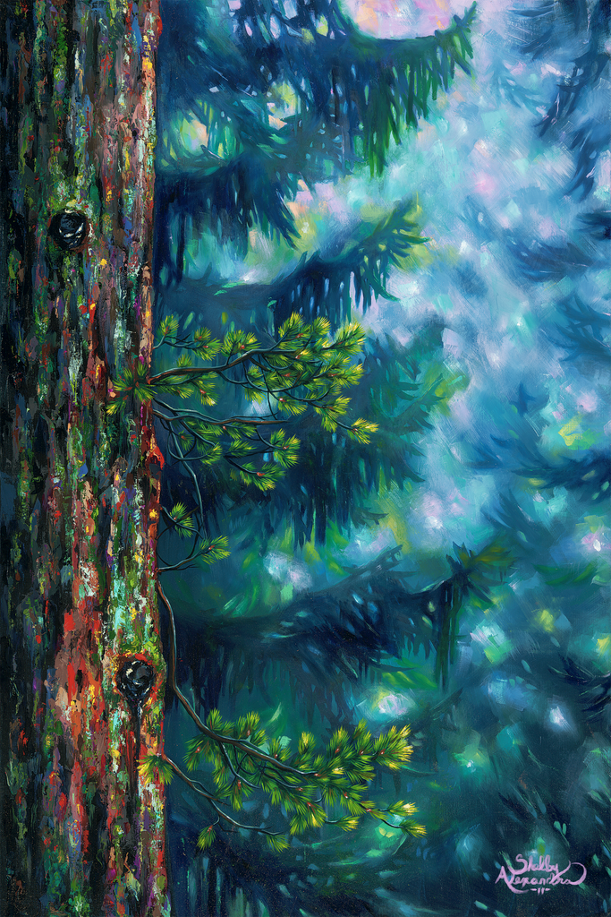 Bring the serenity of a Northwest forest into your living room with "The Painted Pine", an exploration of color, light and solitude. Displaying a mixture of modern and classical oil painting techniques, this piece blends the surreal and the real for a truly unique viewing experience.
